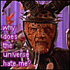 Description: g'kar in a jester's hat, hating the world. text: "why does the universe hate me?"