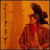 Description: roland deschain before the tower, with a raven on his shoulder. text: runes spelling "eiwaz"